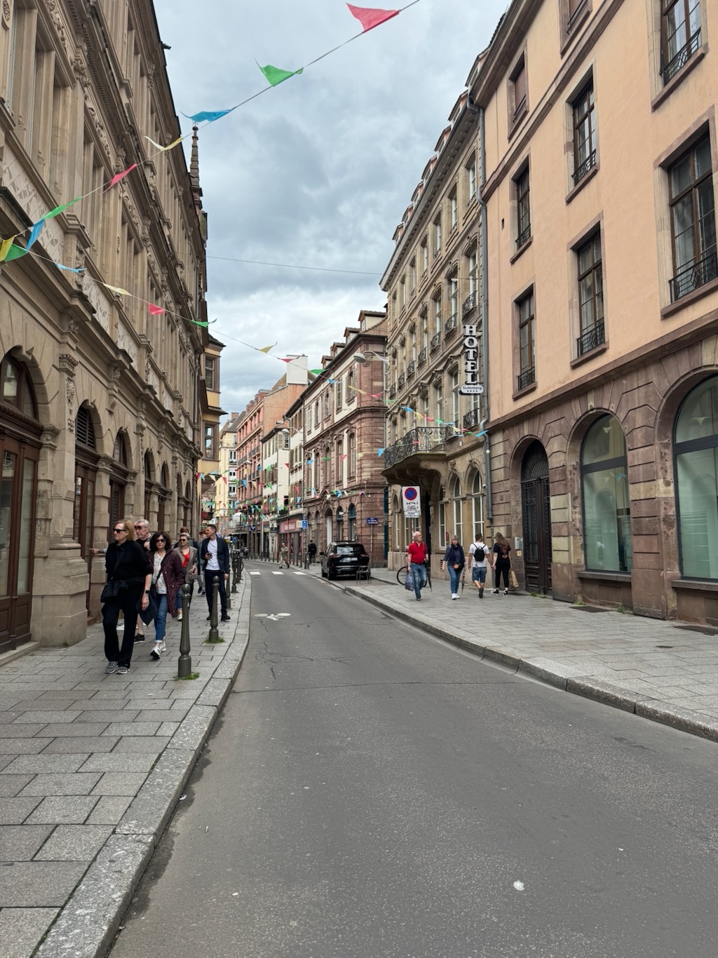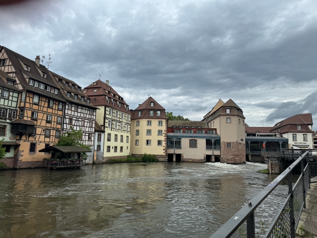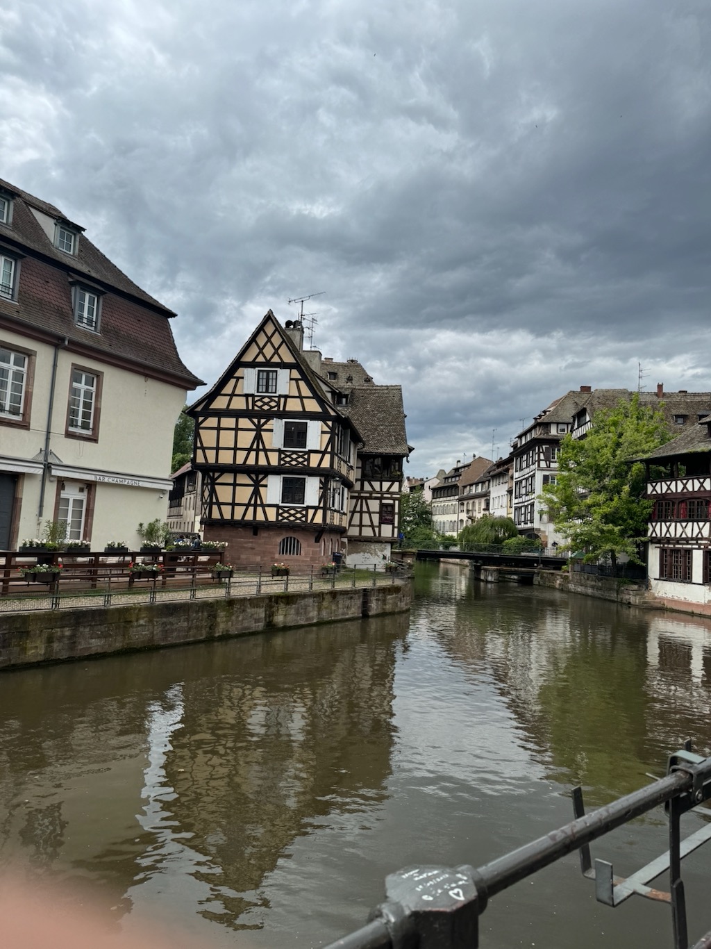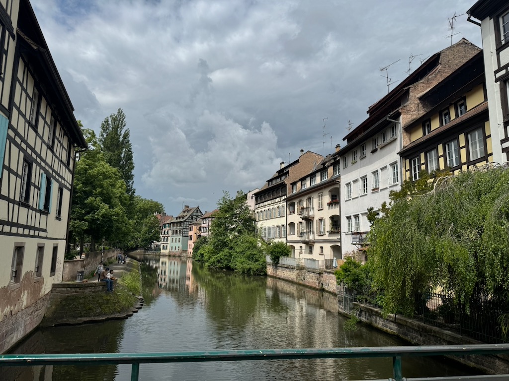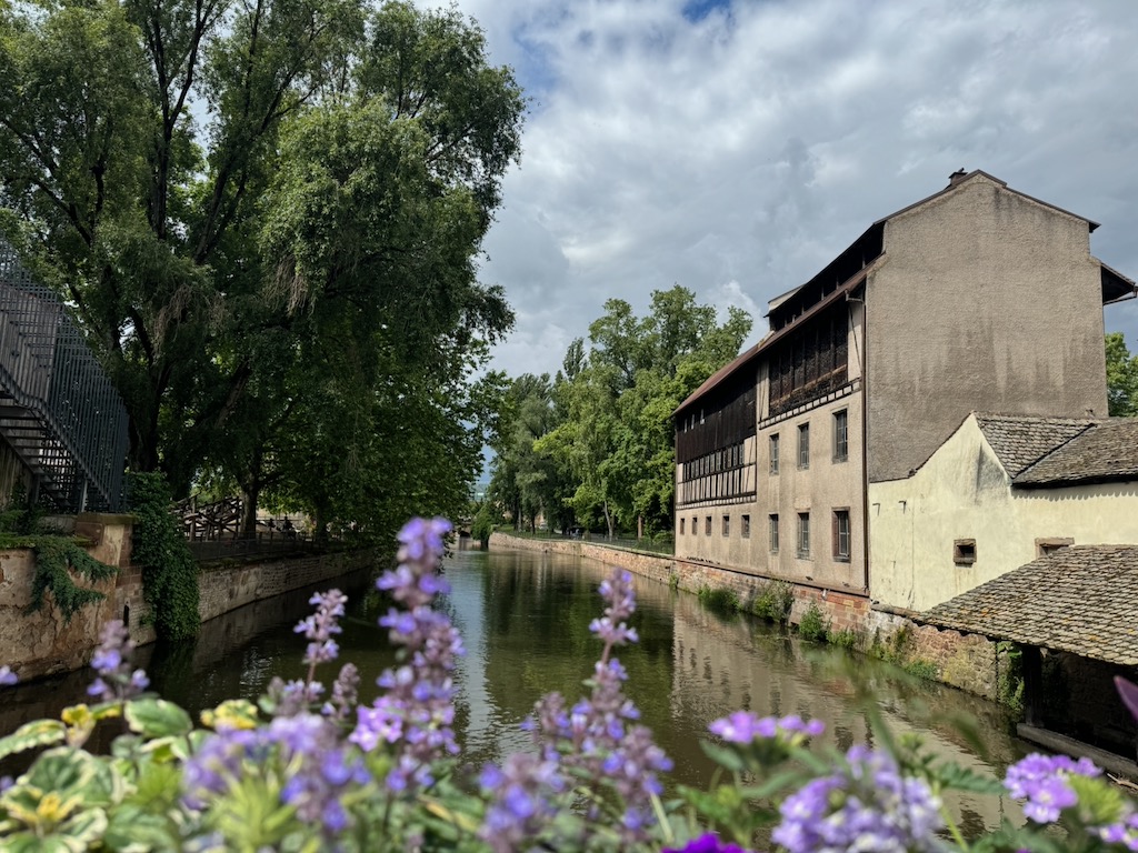 As we continued our walking tour, we learned how Strasbourg—like many European cities—used canals for fortification, travel, and transport. One of the most beautiful areas we visited was La Petite France, where historic timbered buildings sit directly on the water. The reflections, the age of the architecture, and the spring flowers along the canals were so beautiful.