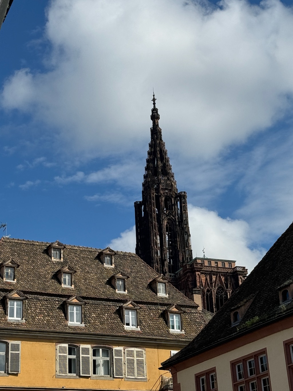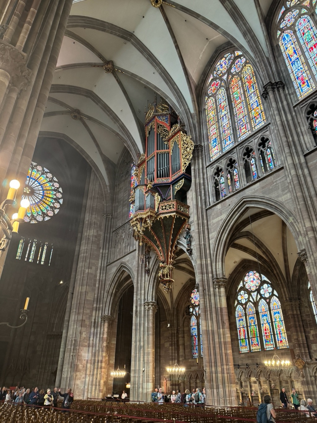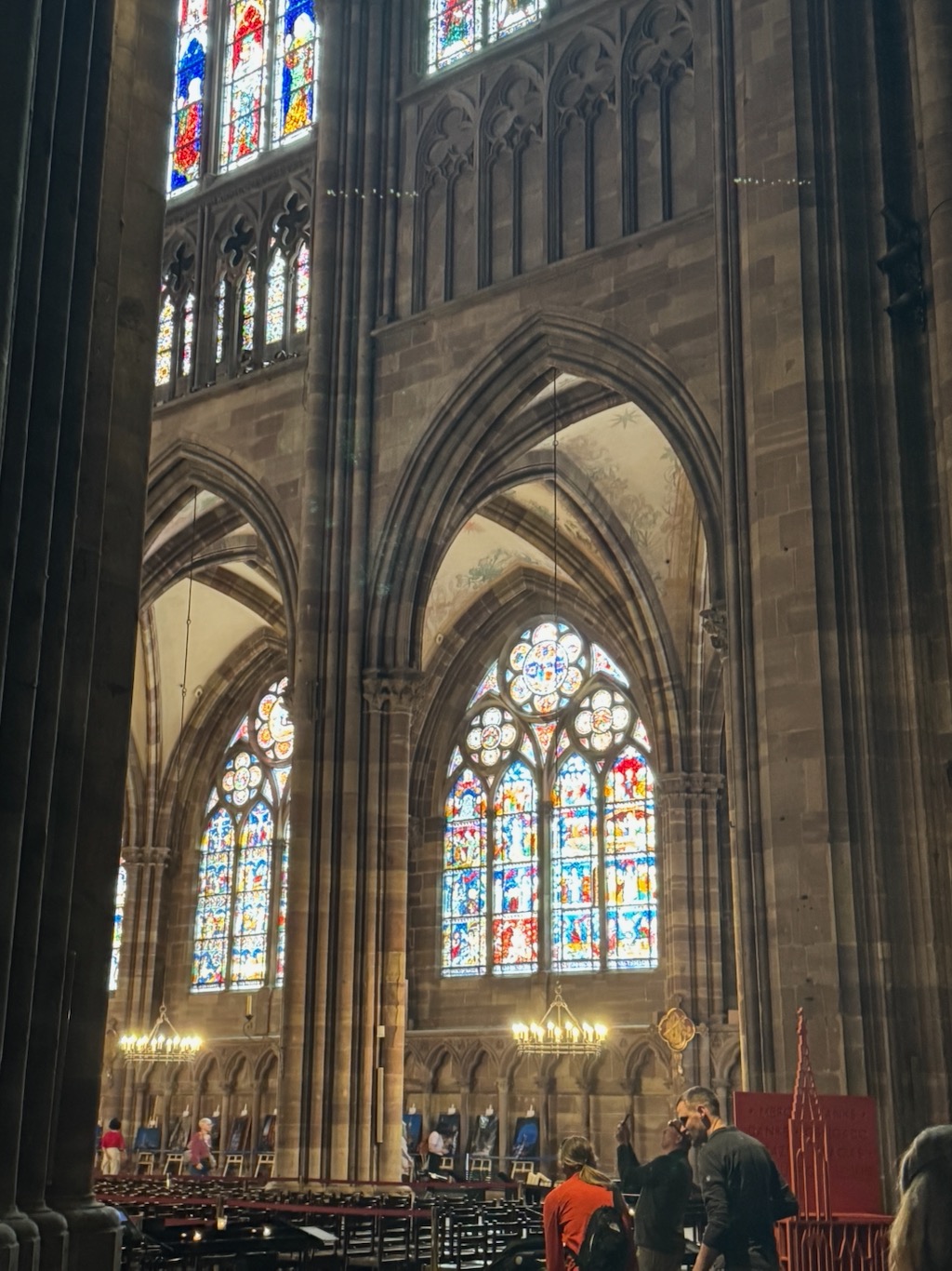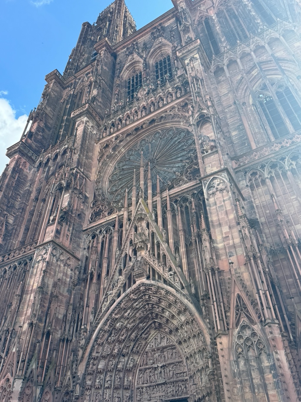 Today we stepped right off the ship and into town for a guided walking tour, our first stop being the Strasbourg Cathedral. For 227 years, it held the title of the tallest building in the world. Builders began construction in the year 1015—that date alone feels almost impossible to grasp—and craftsmen continued modifications and additions all the way through 1874. Designers originally planned two towers, but builders completed only one, giving it its distinctive silhouette.