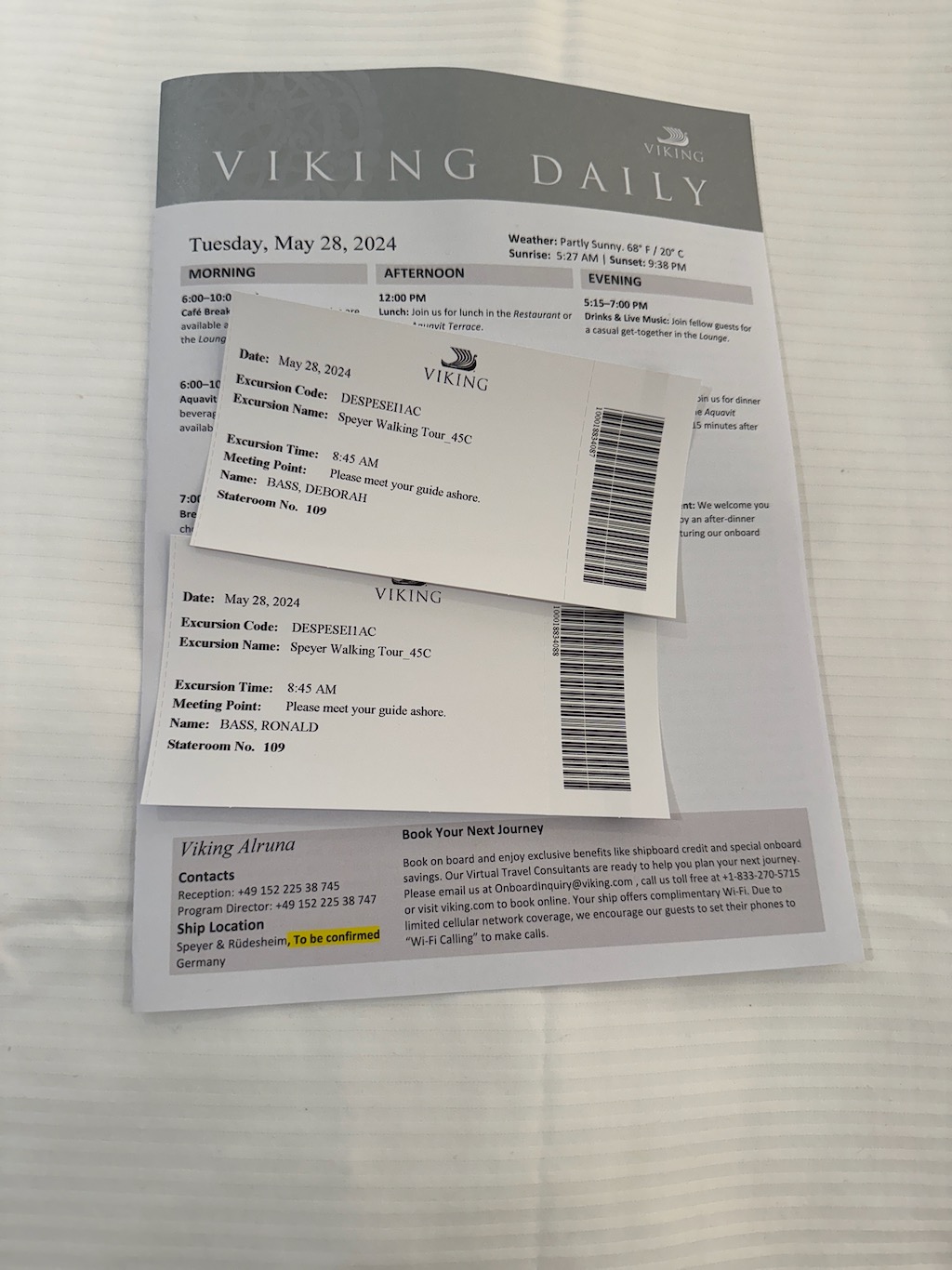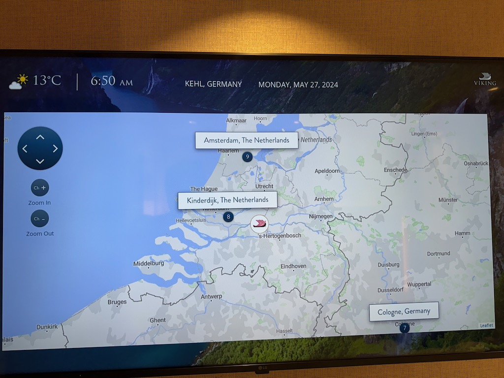 I can’t say enough praises about Viking River Cruises. Every morning our television displayed our location. And every evening our bed was turned down and our itinerary placed on it. Just one of the many amenities.