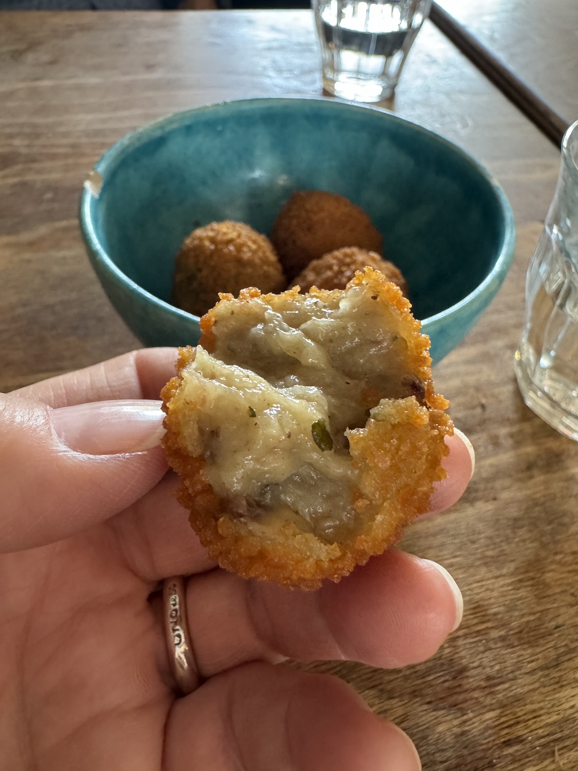 We ordered bitterballen (when in Rome and all that), a traditional Dutch snack—small, deep-fried balls filled with a thick, savory ragout, usually made with beef or veal and served with mustard. They’re popular here, often eaten with drinks, and show up on menus all over the city.