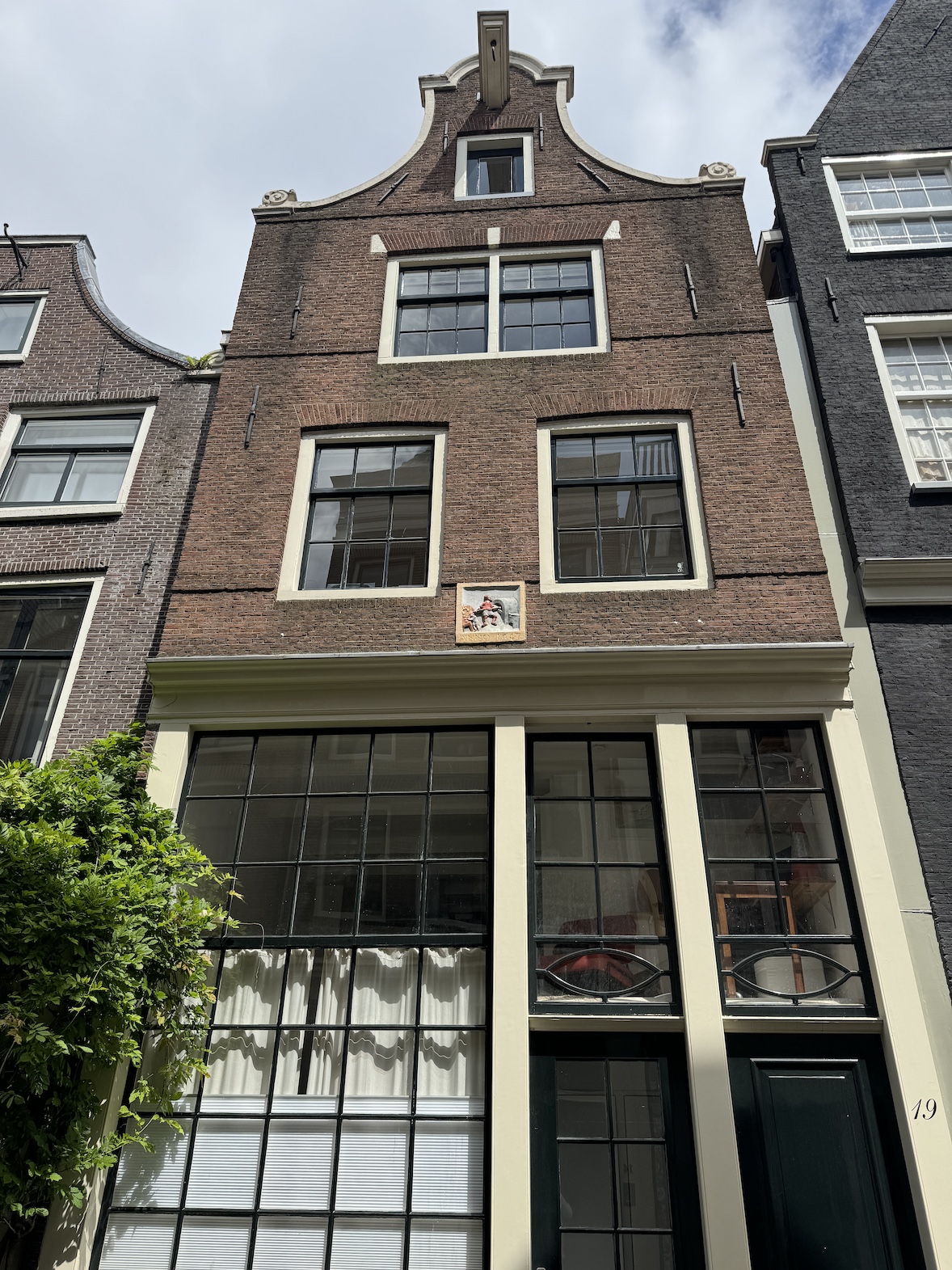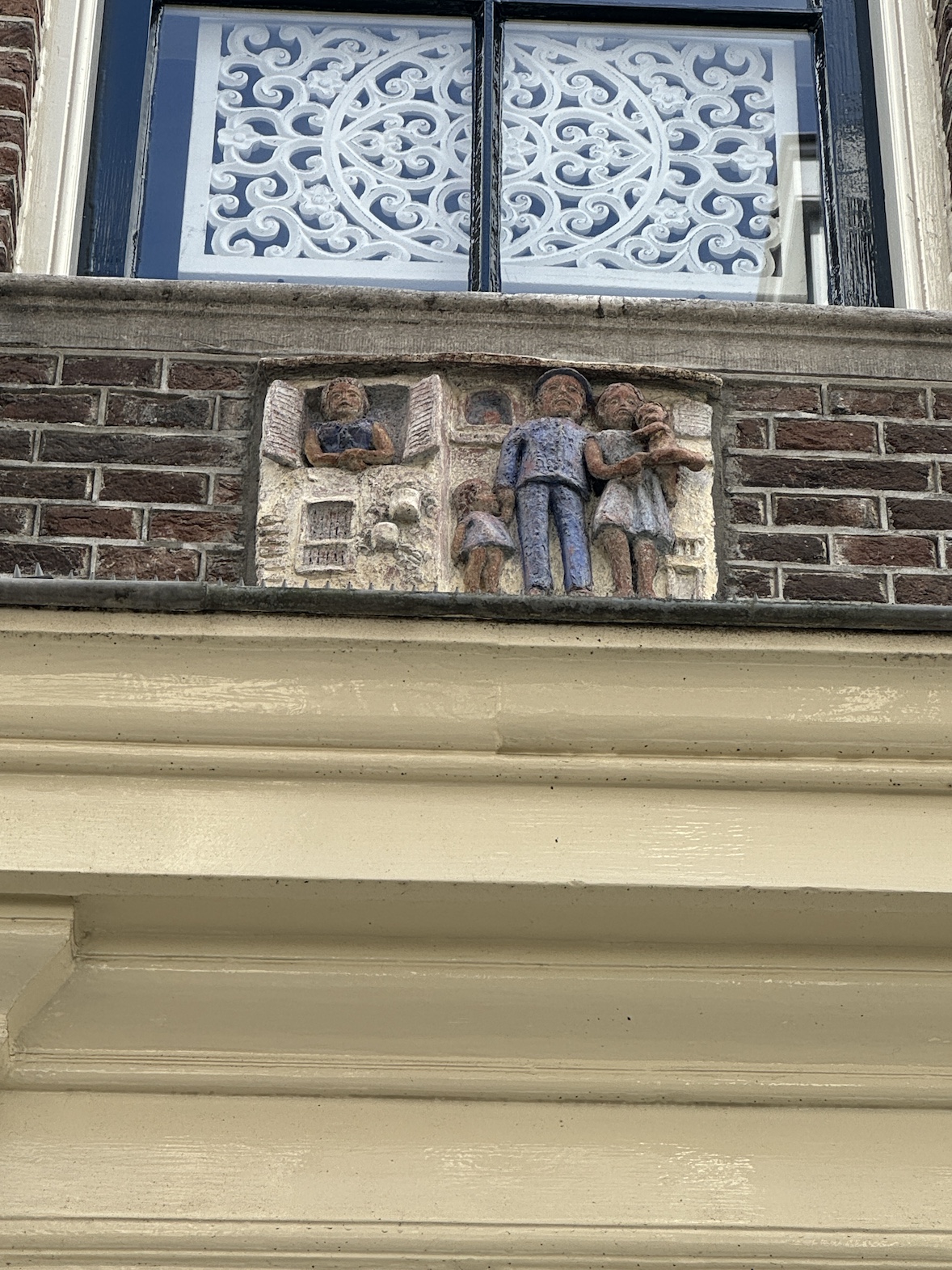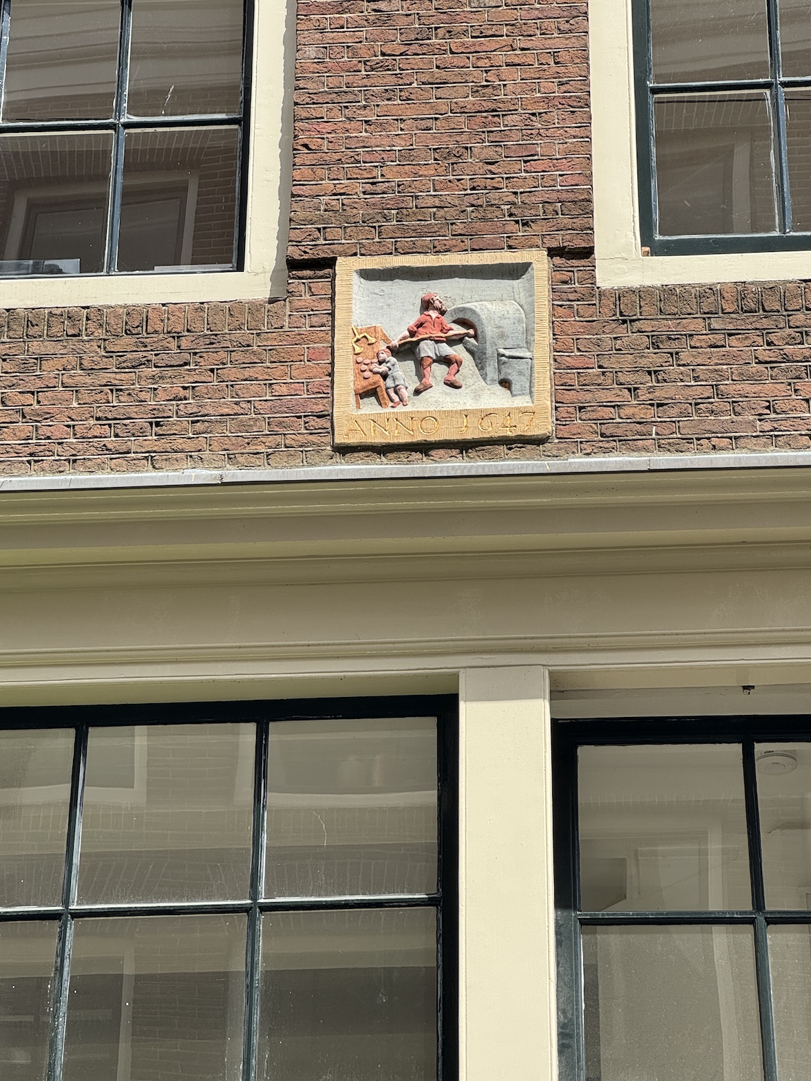 These are called gevelstenen—decorative plaques that date back to the 1600s and 1700s. Before street numbers existed, they were used to identify homes—little visual markers that might represent a trade, a family, or a story.