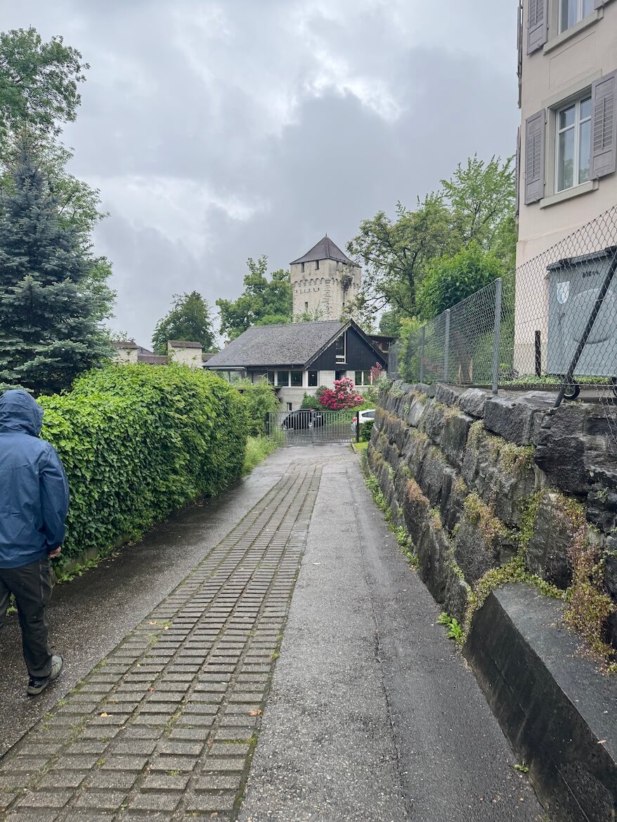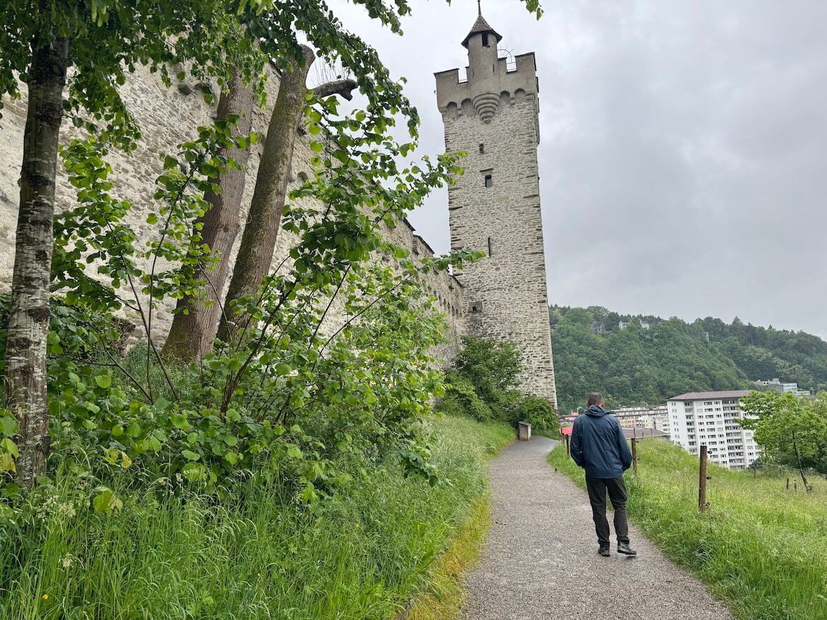 After breakfast, we trekked about a third of a mile uphill in a very charming walk to the Musegg Wall, a medieval fortification built in the 1300s to protect the city. It’s quite impressive and offers panoramic views of Luzern, the lake, the Reuss River, and the surrounding mountains. Only nine towers remain. Modern houses settle in like puzzle pieces, and the wall and towers seem to still stand as protector over the city even now.