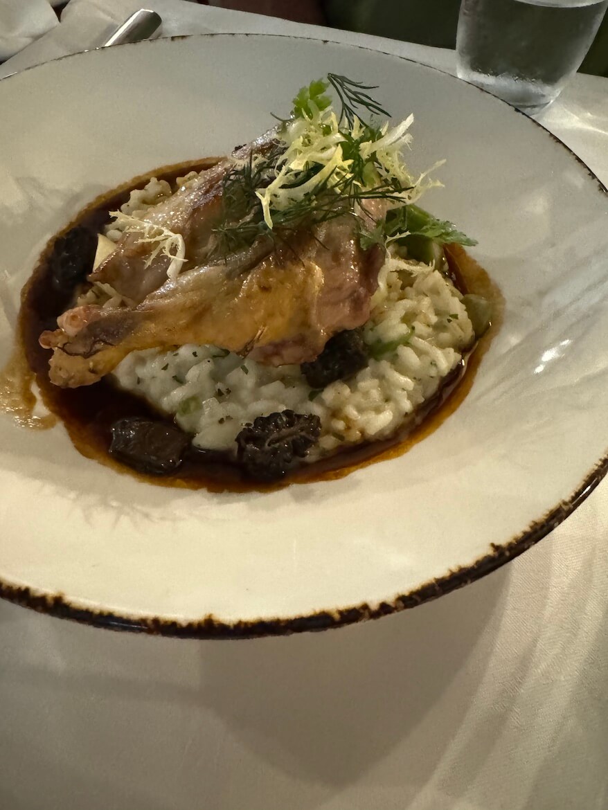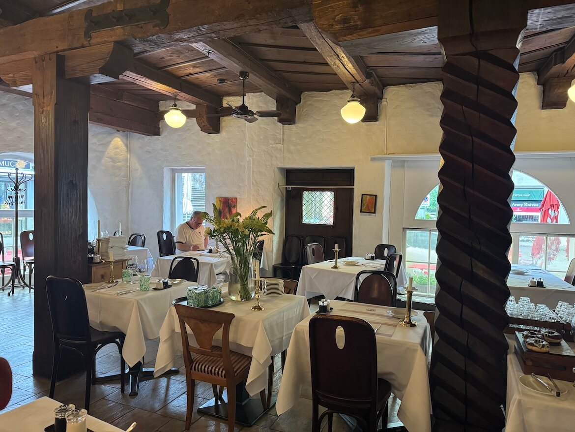 I loved that we got to taste a genuinely historic Swiss meal in a setting that’s remained largely unchanged for generations. The building first opened as a tavern in 1517, and you can feel that history in the timbered ceilings, worn stone, and hushed energy of the room. The food was thoughtful and delicious, but the ambiance—dark and reserved—lent itself more to reflection than celebration.