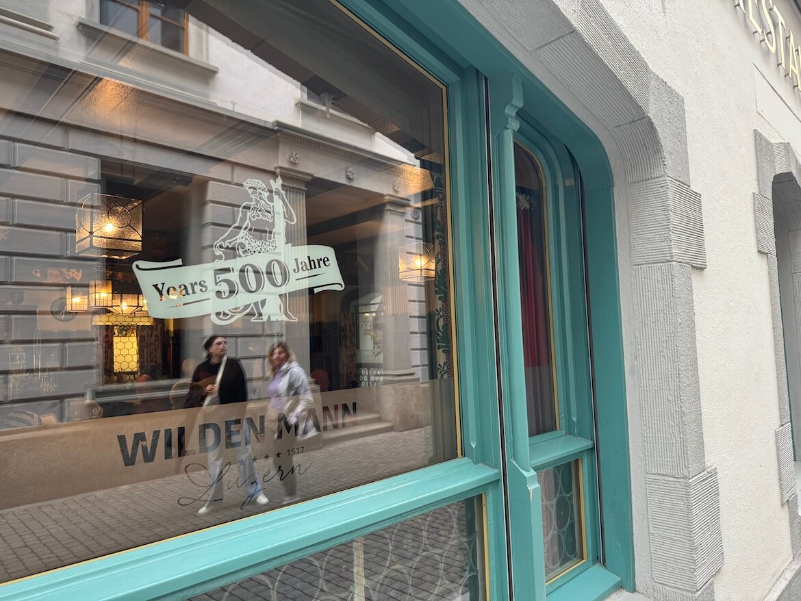 Next up: a traditional dinner at Burgerstube, the restaurant inside Hotel Wilden Mann. I don’t remember how we landed on this spot—but I’m glad we did. The hotel has been a fixture in Luzern’s cityscape for over 500 years, making it one of the oldest continuously operating hotels in Switzerland.