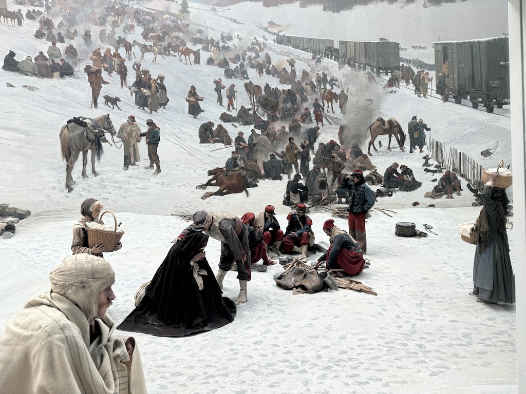 To heighten the realism, they added a 3D foreground: sculpted snowbanks, a real railway car, props, campfires, and mannequins wrapped in wool cloaks. The result is a layered, immersive experience that blurs the line between art and witness.