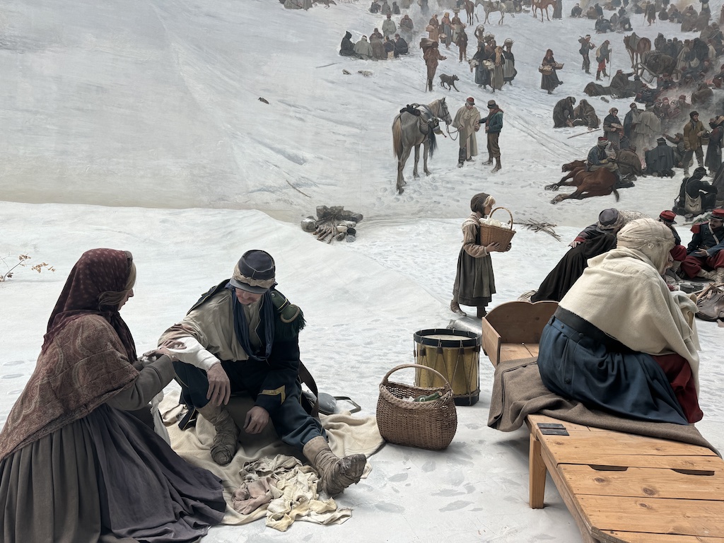 I’ve tried to capture the beauty of the piece, but photos just don’t do it justice. The installment is in a huge rotunda. The visitor’s platform is raised, accessible via steps (and somewhere an elevator) and the entire panoramic canvas—paired with 3D elements in the foreground—creates a surreal space. Surrounded by “snow” with life-sized props of women and children helping wounded men, along with the hush of the rotunda felt eerily real. I practically shivered from the cold, vast winter scene. It was as if, the best one can manage from a distance of more than 150 years, I was there. The still, silent room evoked the same dead-quiet cold space I’ve experienced in Tahoe when the falling snow silences the world. Ron and I lingered a while to take it all in.