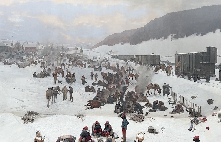 The installment portrays an important event. In February 1871, during the final days of the Franco-Prussian War, more than 87,000 French soldiers from the Army of the East—led by General Bourbaki—retreated into neutral Switzerland after being surrounded near the Jura Mountains. The Swiss agreed to disarm and shelter the troops in what became one of the earliest large-scale humanitarian efforts in modern European history.