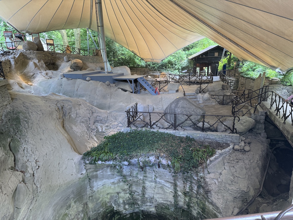 Inside the Felsenwelt (German for Rock World), we stepped into a dark, immersive tunnel. In one chamber, water swirled in a stone basin—a working model of how glacial potholes are formed.