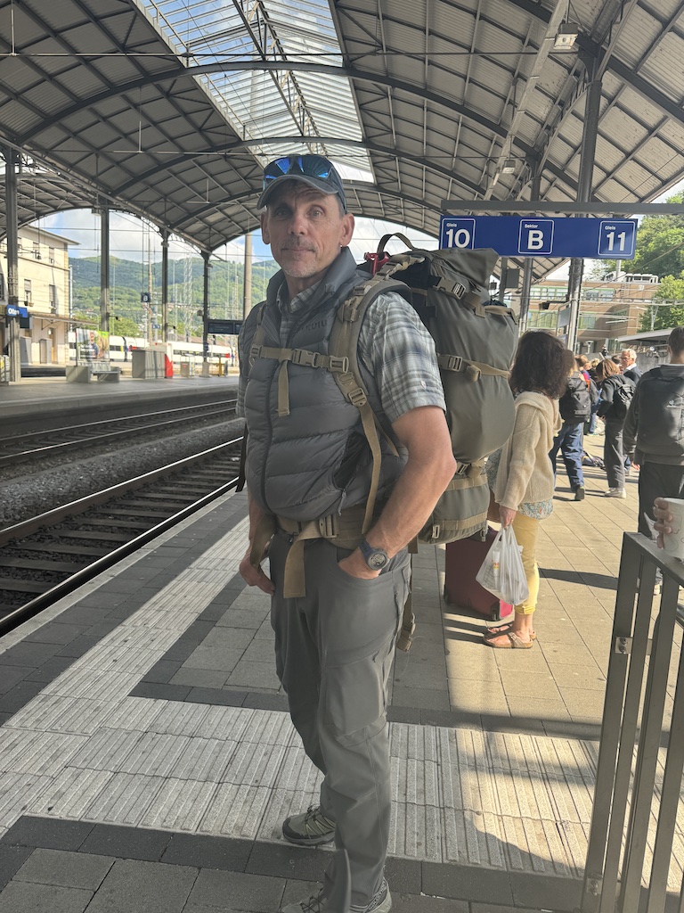 Lauterbrunnen train station on a misty morning—ready to board our train to Basel.