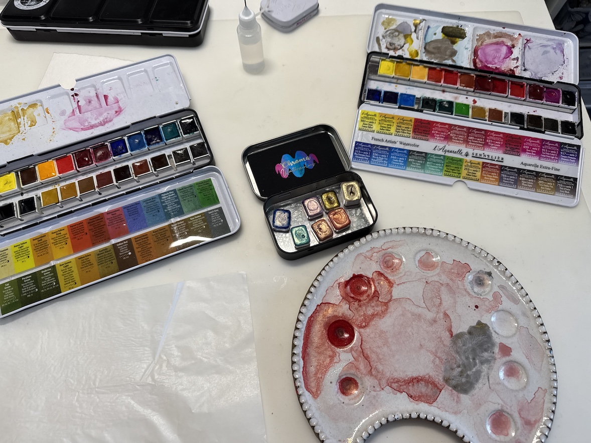 I use metallic watercolor paints from two different vendors: ChromaWatercolors and CSY Art Gallery.