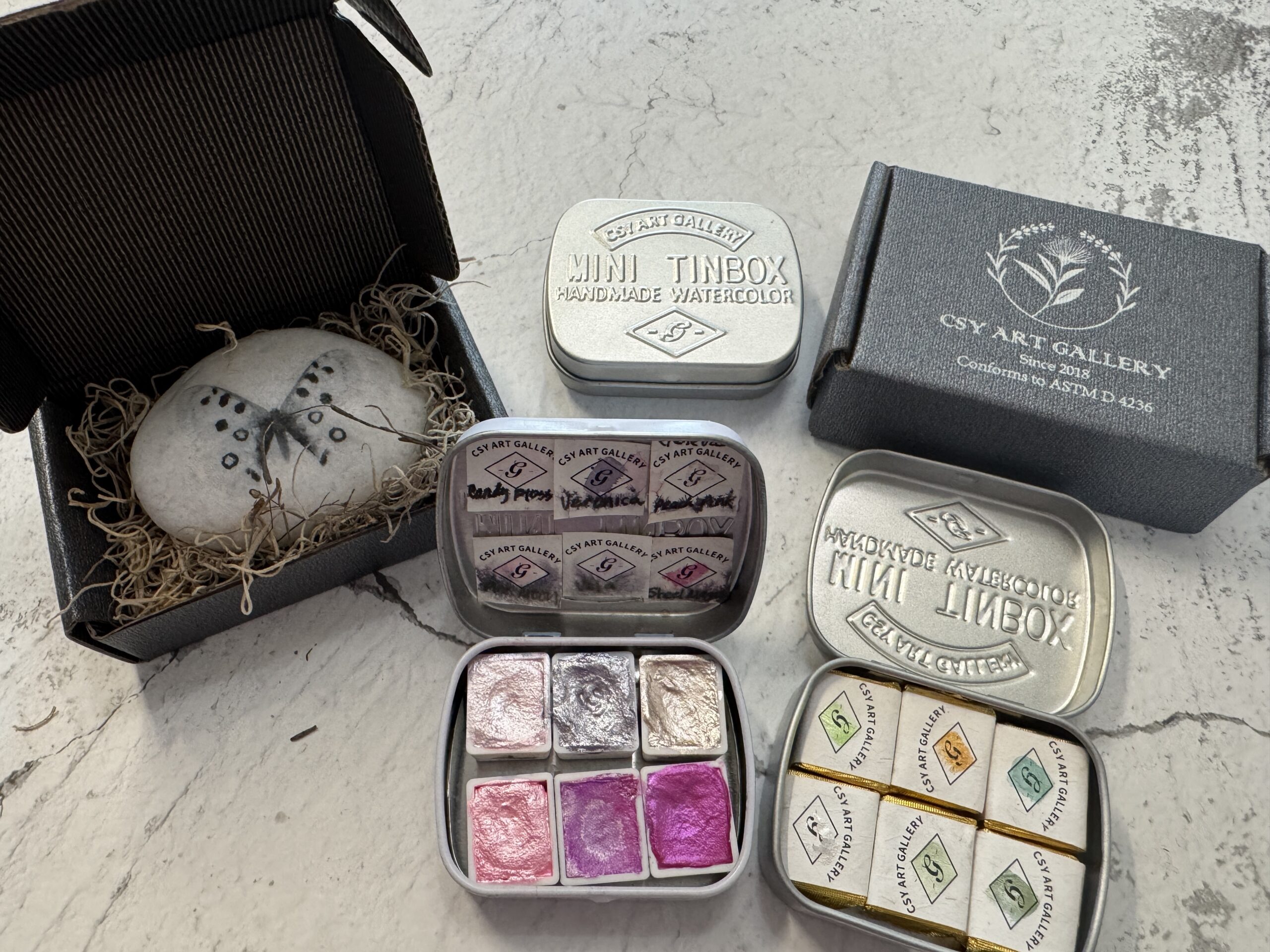 As an added bonus, I reuse the boxes the CSY Art Gallery paints arrive in for gifting. They are especially perfect for gifting paperweights I make using white rocks and an image printed onto tissue paper. It’s a little tricky!